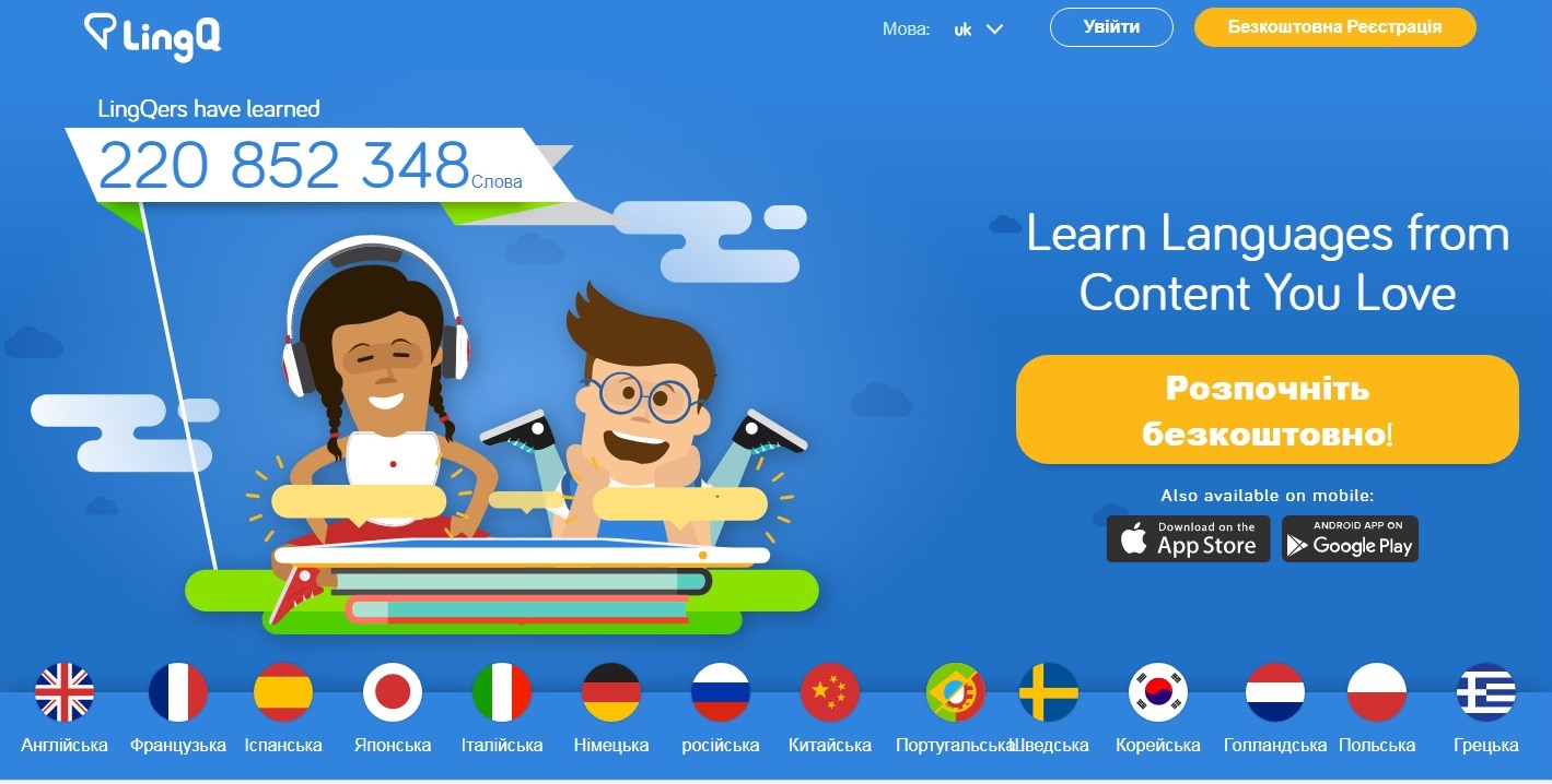 Вивчення іноземних мов: https://www.lingq.com/uk/
